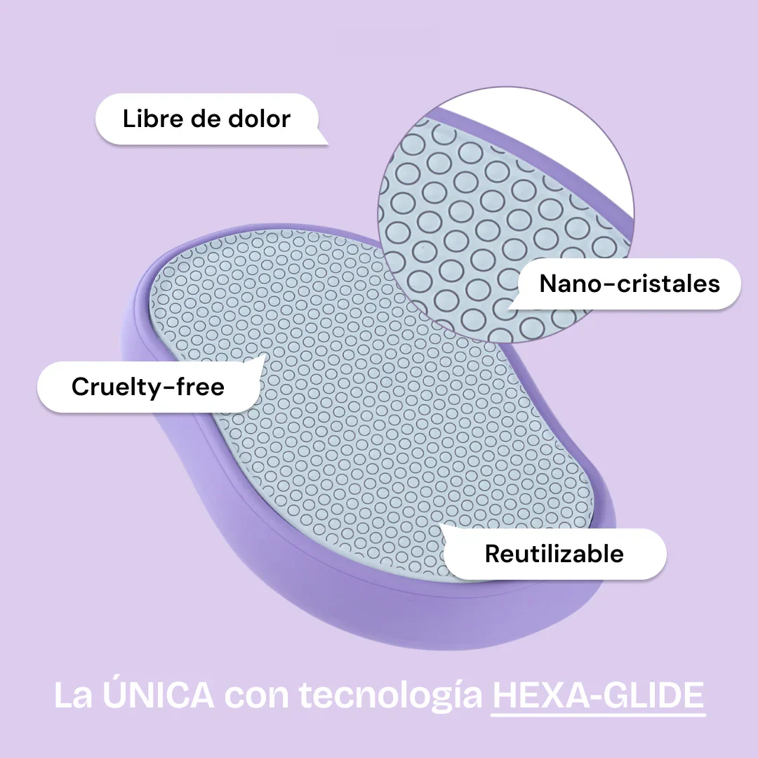 La tecnología Hexa-Glide revoluciona la depilación con su patrón hexagonal de nano-cristales, diseñado para minimizar la fricción y maximizar la eficacia en la eliminación del vello.